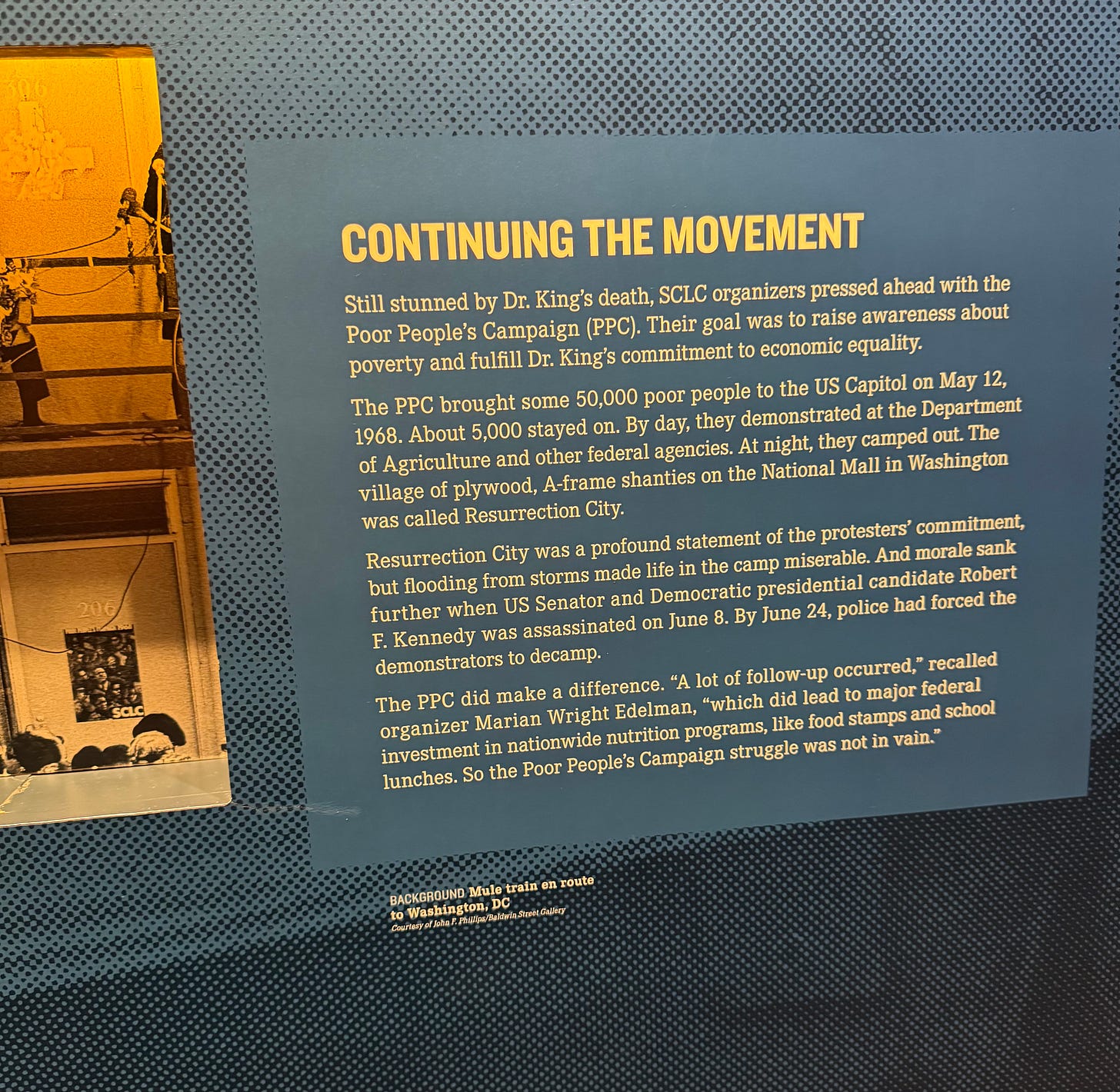 Dr. King’s career was shaped by the challenges he faced while sharing his message of civil rights. His work had made him both a celebrated leader and a target of intense opposition. By the time of his assassination, he experienced waning public support and intense government efforts to stifle his influence. He carried the full weight of FBI surveillance. The arc of his leadership offers us a chance to look at what is at stake when resistance becomes a threat for those in power. Dr. King persisted, fully aware of the dangers he faced. He called for a moral revival that would undercut the nation’s persistent blindness to inequities and bring about repair. In the months leading up to his assassination in 1968, King launched the Poor People’s Campaign.