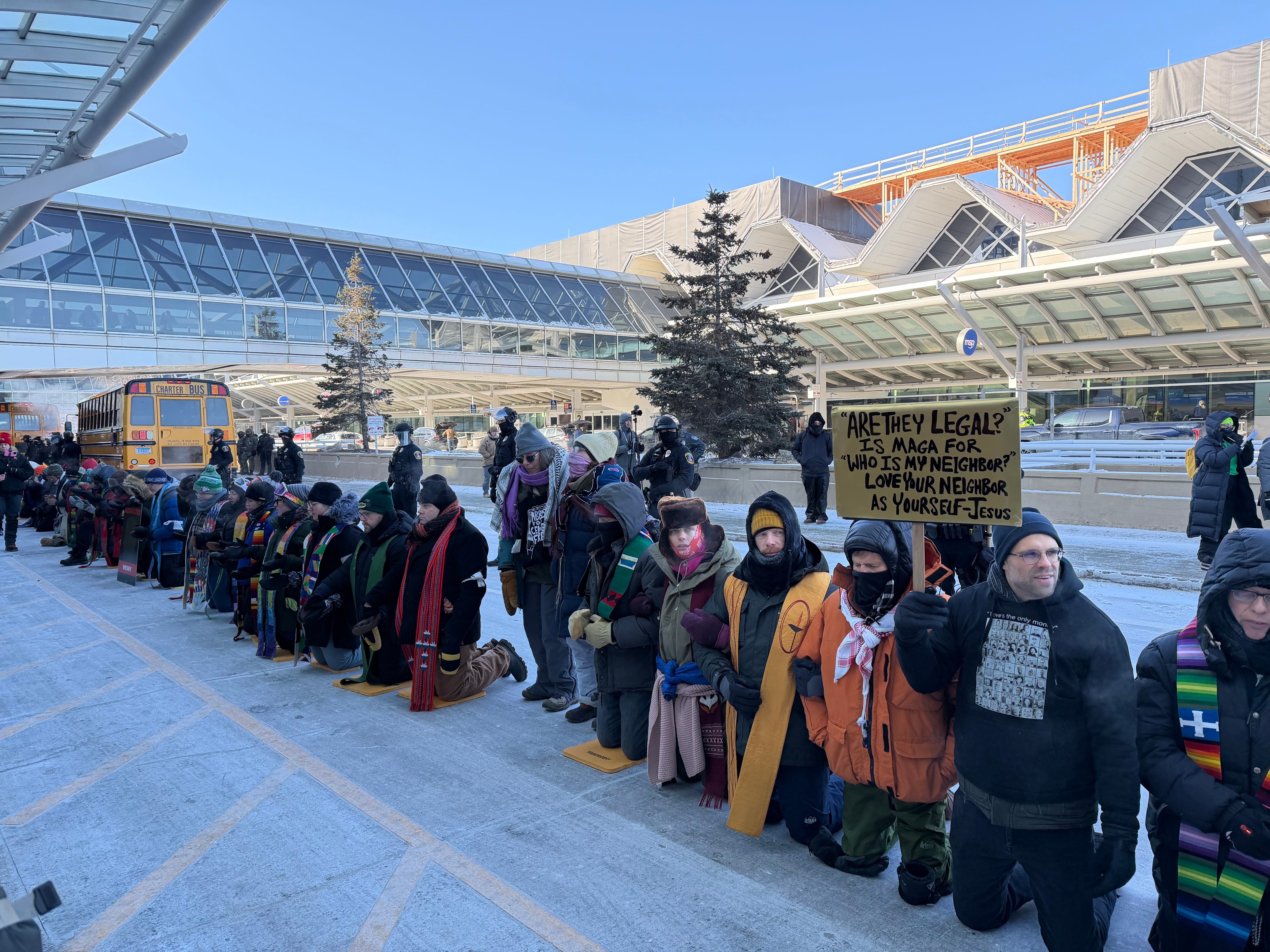 On this Day of Prayer and Fasting for Truth and Freedom, as the faith leaders were calling it, I would participate in an action at the airport to demand Minnesota corporations stand against ICE and their occupation of our city. The faith leaders called for prayer to acknowledge the moral crisis we are in, and fasting (from work, school and shopping) to say “enough!” We cannot in good conscience continue with business as usual. This attack is the outcome of a decades-long effort of corporations and the extremely wealthy to undermine our democracy. This spectacle of cruelty is meant to distract us and the Christian message in it is, this treatment of people goes against the lessons of Jesus. Their leadership has connected me back to a younger self who learned about Jesus in Sunday School, before she became jaded by the messages of Christian Nationalists, watching those in power choose greed over what I thought Christianity was about.